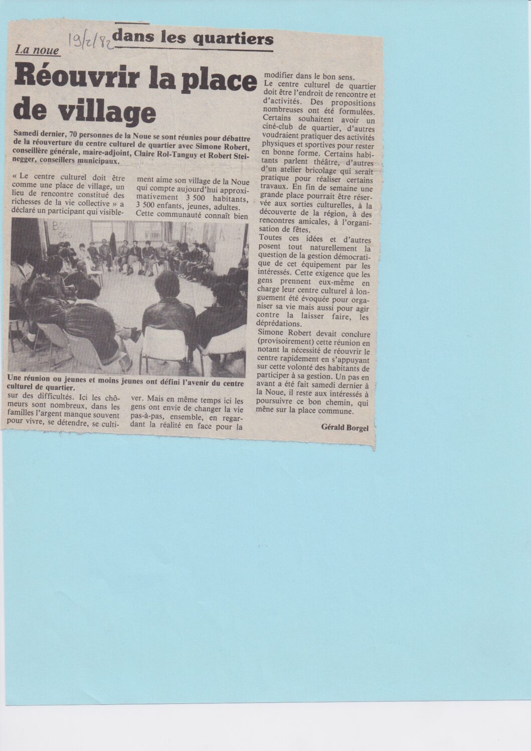 Samedi dernier, 70 personnes de la Noue se sont réunies pour débattre de la réouverture du centre culturel de quartier avec Simone Robert, conseillère générale, maire-adjoint, Claire Rol-Tanguy et Robert Steinegger, conseillers municipaux.